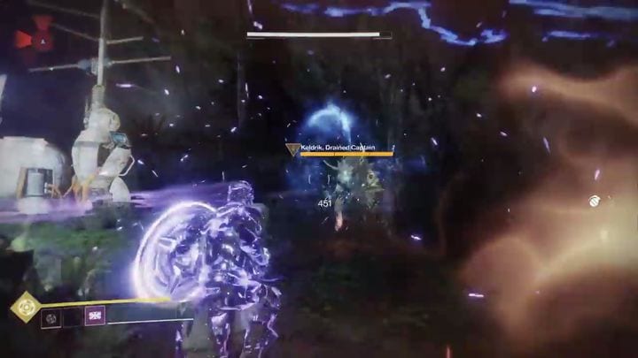 Snipe the enemies on the far right using the concrete for cover. Leap across the chasm to the upper floor on the left and continue along the path leading up to the boss area. Snipe Keldrik Drained Captain then perform the Super to deal significant damage. Finish off any remaining enemies in the area. When you’re done, collect the Cache code and unlock the loot chest.