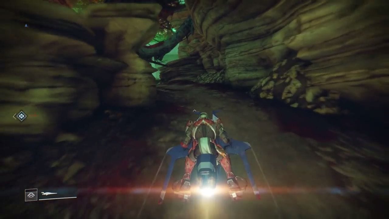 Keep going taking the road sandwiched by concrete. Once you reach the crossroads, dislodge the Sparrow and take the right path. Scale the right ledge and boost yourself up to the the upper floor. Stick to the right wall and leap across to the cliff on the opposite side. Boost up to reach the path straight lined with foliage, then with a final leap ascend to the white platform on top. Jump off to the path shrouded in red vegetation, follow the path straight then dislodge the Sparrow once you reach a crossroad that branches to the left and straight.