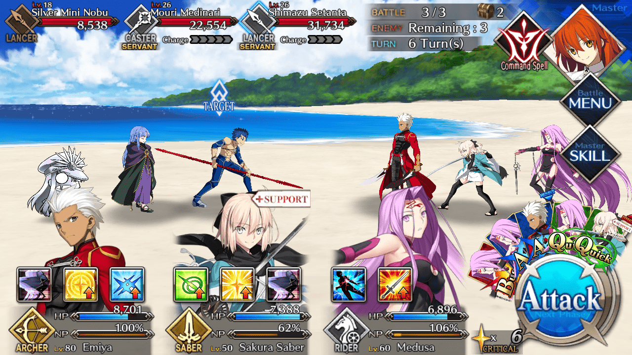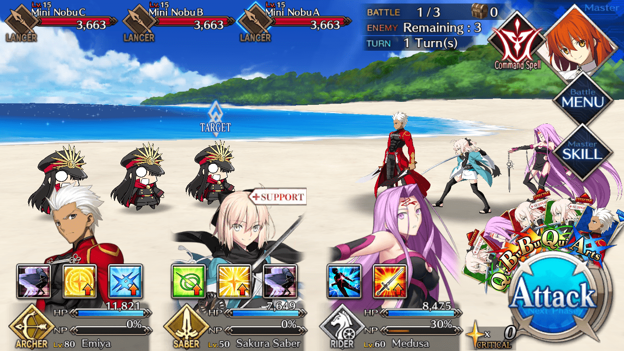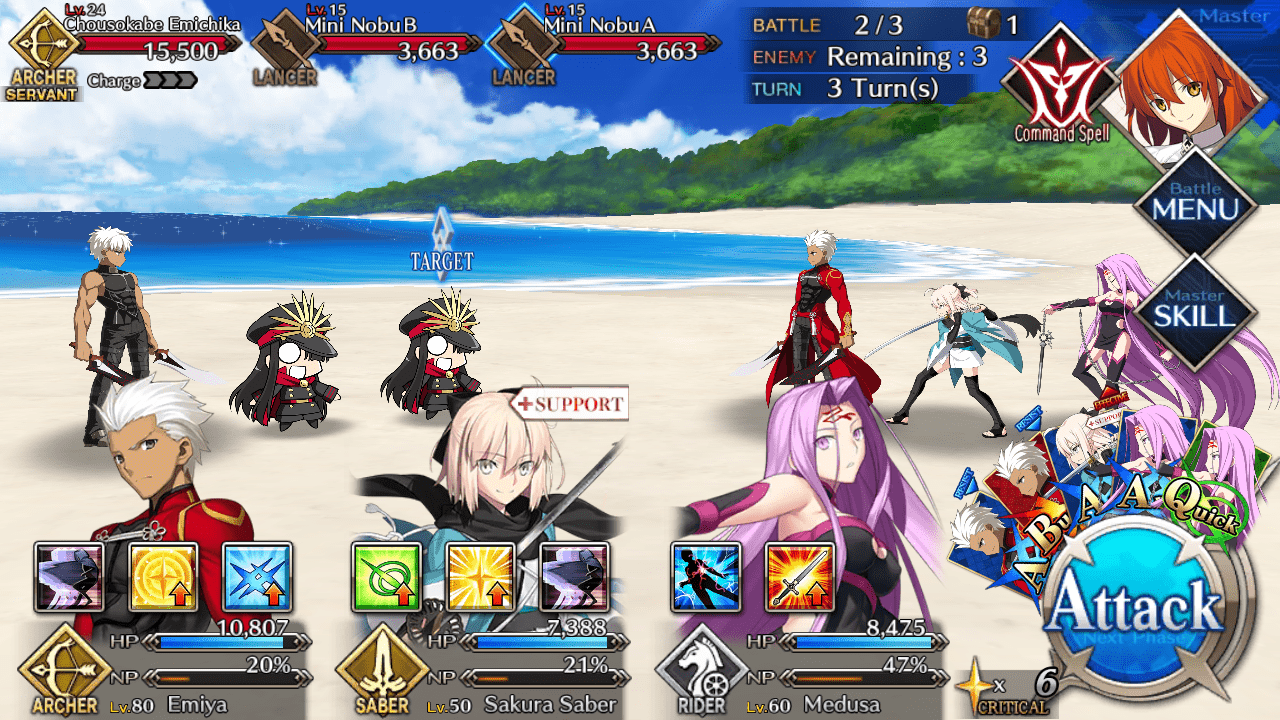 | Chokosabe Emichika (EMIYA) (Lvl 24/ Archer/ 15,500 HP ) | Mini Nobu (Lvl 15/ Lancer/ 3663 HP) | Mini Nobu (Lvl 15/ Lancer/ 3663 HP) |
