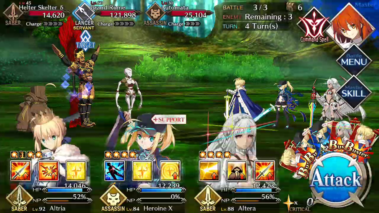 | Helter Skelter δ (Lvl 45/ Saber/ 14620 HP) | Grand Rome (Lvl 60/ Lancer/ 121898 HP) | Automata (Lvl 30/ Assassin/ 25104) |