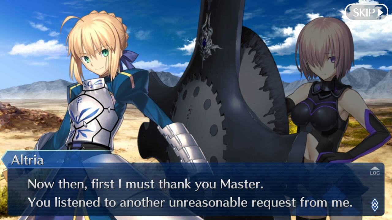 Altria leads Mash and the protagonist to the wasteland of Septem. The two are unaware of her purpose until she reveals the means to awaken the holy sword: Excalibur. Unfortunately, she never fought with her true power due to it having multiple oaths that bind it. One of the oaths is for her never to strike one pure of heart and never to strike a fairy. To fully awaken her Noble Phantasm, Altria intends to have the protagonist, Mash, and she to face down the fearsome dragon and daemon that she once sealed away.