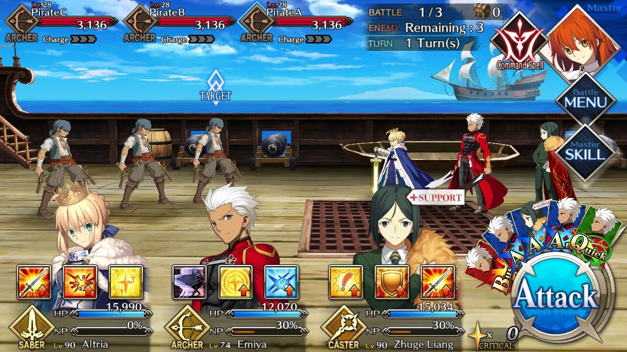 • Once you reach the final wave of the Band of Corsairs Quest, you’ll face the Pirate Boss who has 13,000++ HP. However, he should be easy to whittle down if you have an Archer class servant. If you don’t, this battle may take awhile due to his higher HP and slightly increased defense.
