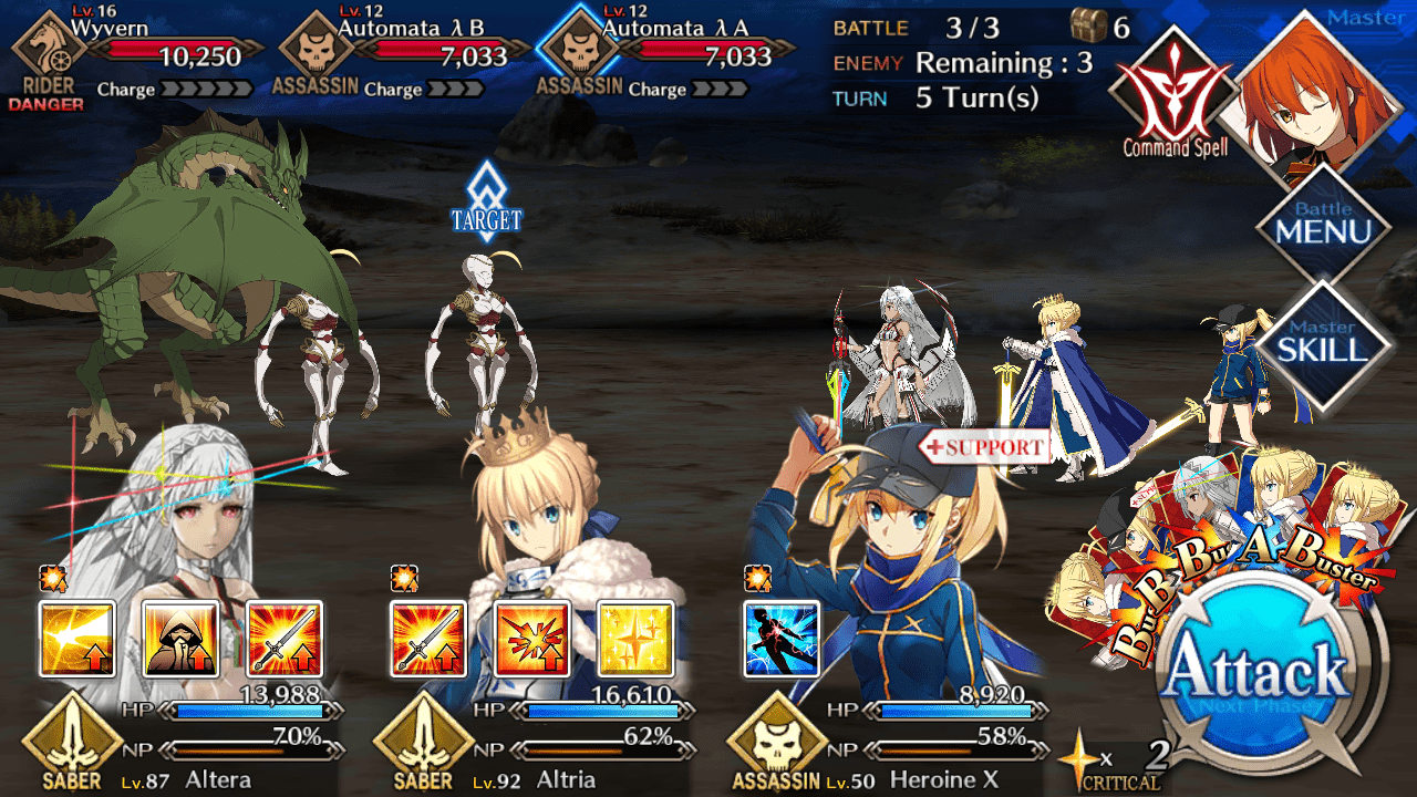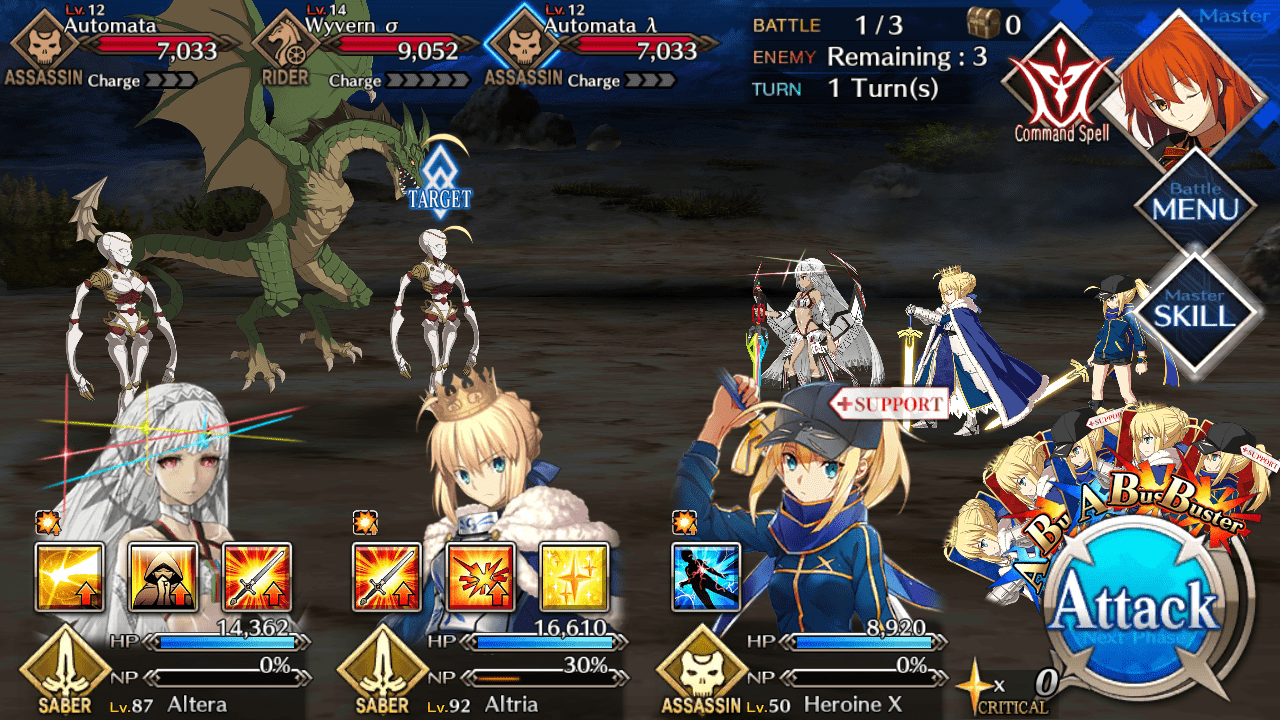 | Automataλ (Lvl 14/ Assassin/ 8105 HP) | Automata (Lvl 12/ Assassin/ 7033 HP) | Wyvern σ (Lvl 14/ Rider/ 9052 HP) |