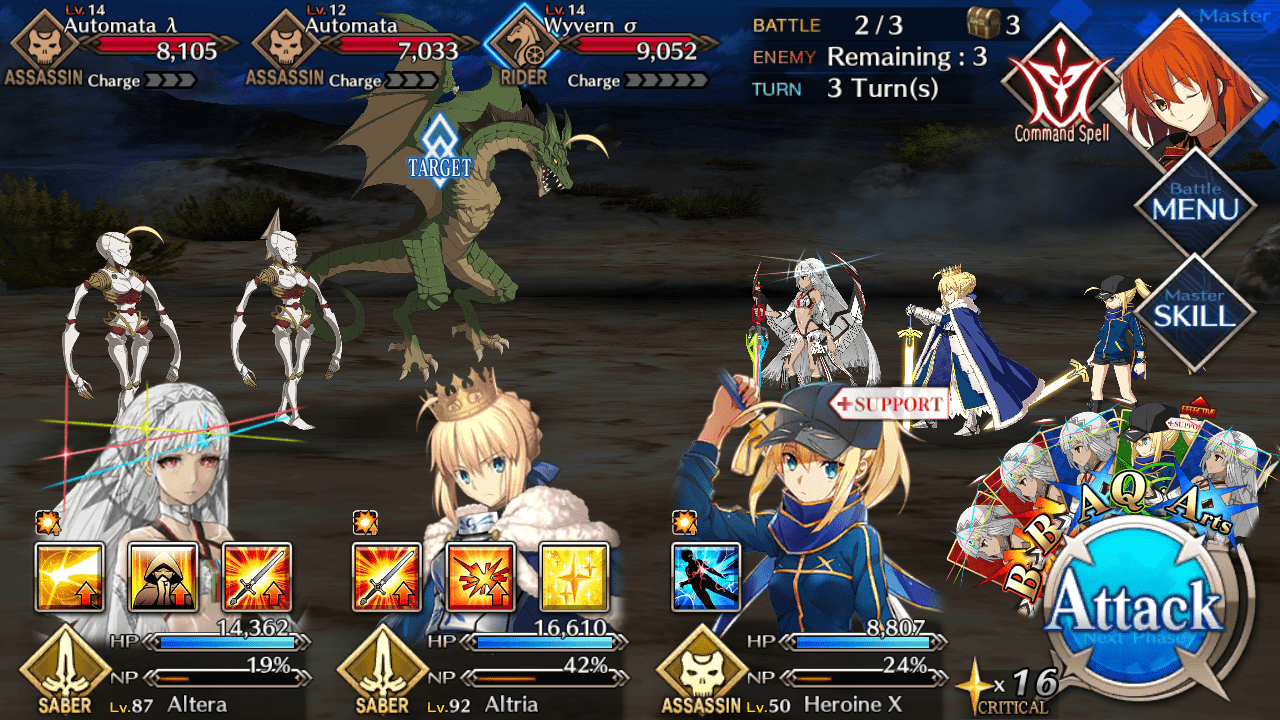 | Automata (Lvl 12/ Assassin/ 7033 HP) | Wyvern σ (Lvl 14/ Rider/ 9052 HP) | Automataλ (Lvl 12/ Assassin/ 7033 HP) |