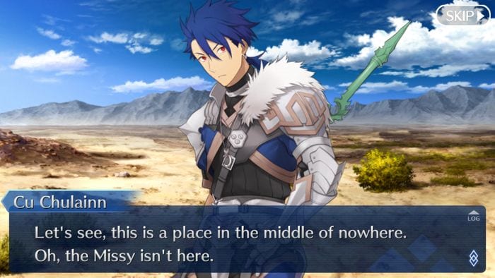 Shortly after regaining consciousness, Cu Chulainn (Prototype) appears before you with an awkward greeting. It remains unknown as to how you ended up in this foreign place, however the conversation is cut short as the both of you overhear the clamor of soldiers.
