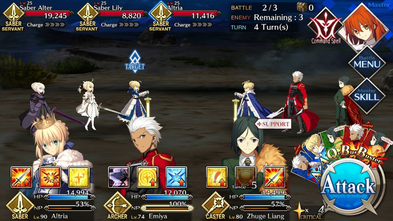 | Saber Alter (Lvl 25/ Saber/ 19245 HP) | Saber Lily (Lvl 25/ Saber/ 8820 HP) | Altria Pendragon (Lvl 25/ Saber/ 11416 HP) |