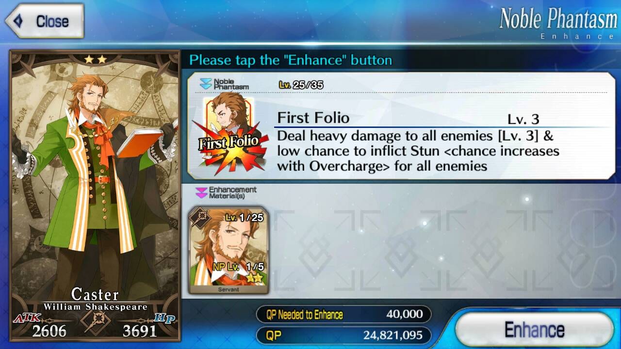 The max level of the Noble Phantasm is Level 5. When enhancing the Noble Phantasm, it either increases the effect or the damage output of the said Noble Phantasm. However, summoning can be quite expensive especially if one intends to level up the Noble Phantasm of a 5 Star Servants such as Altera and Gilgamesh. Hence, most people power up 1~3 star servants and utilize them more due to the higher probability of earning them.