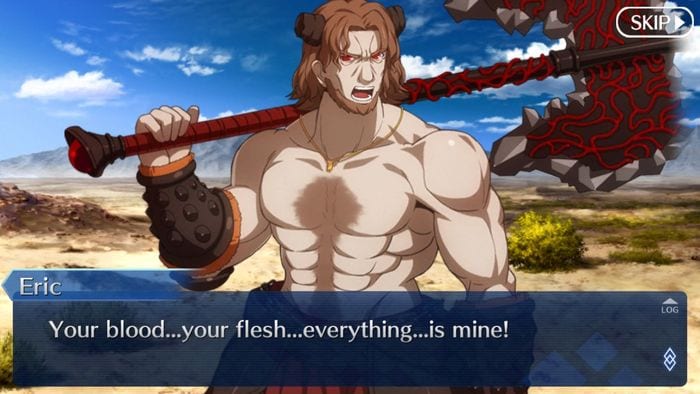 Mash attempts to ask how Eric is feeling but unfortunately the Berserker’s eyes glows bloodshot and uncontrollably bursts to rage. Concerned about their ally, Fou and Mash tries to calm him down but unfortunately Eric begins to speak in an unknown voice filled with anger.