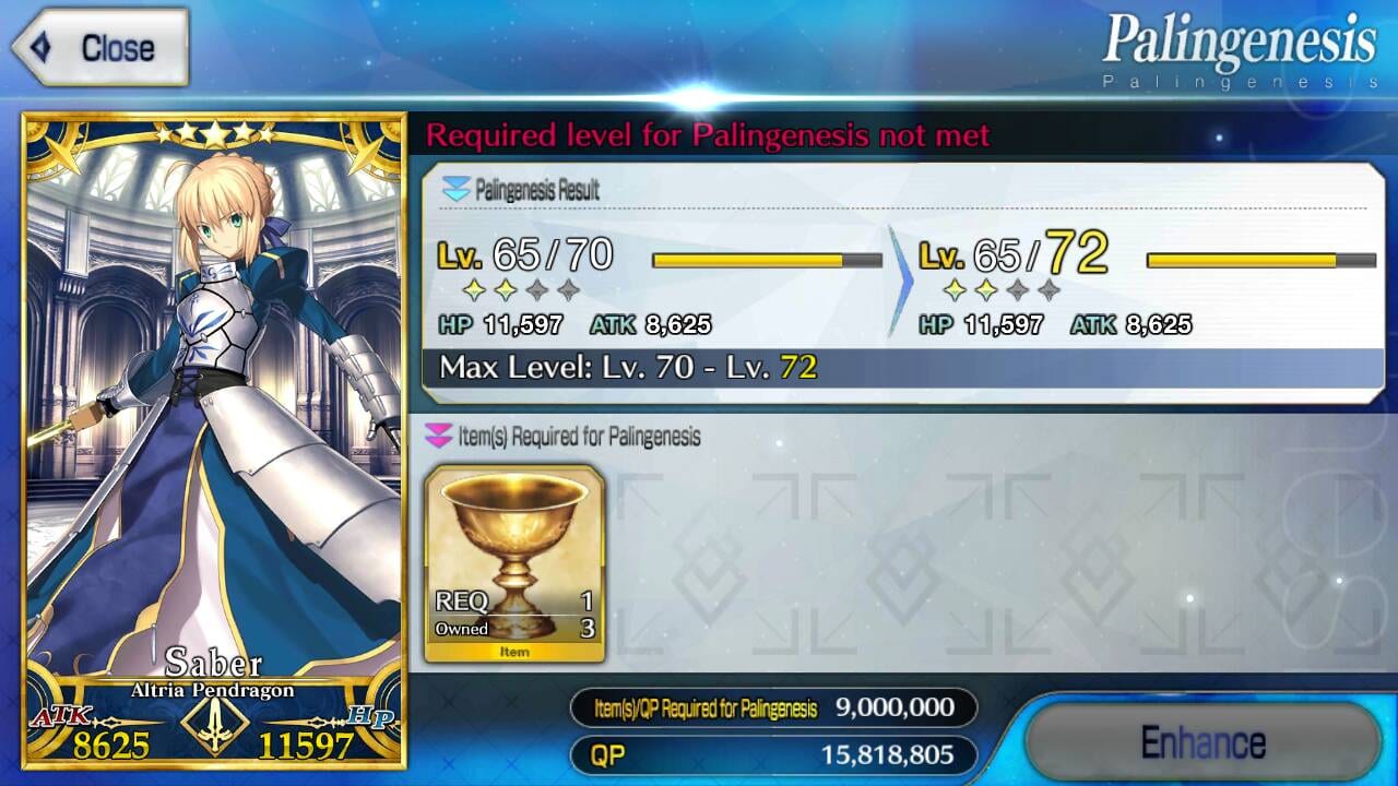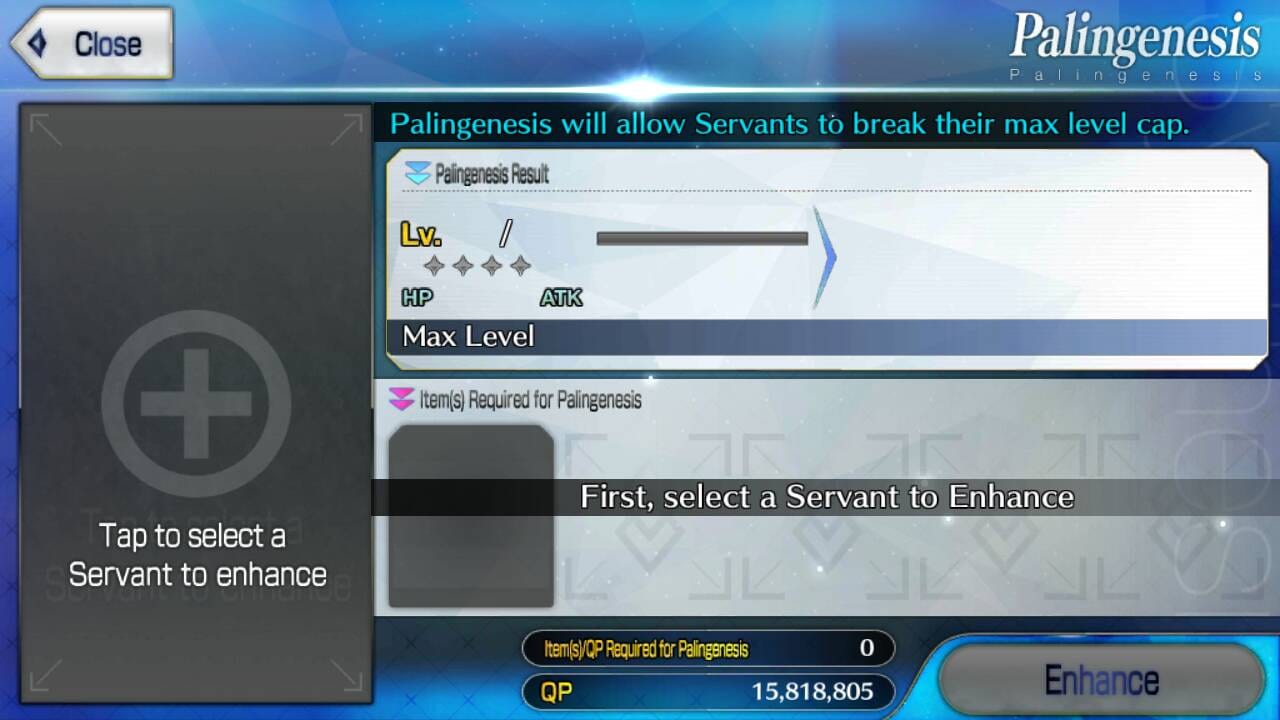 This method works best with servants that are maxed out in terms of Ascension stages. Before performing Palingenesis on the servant, make sure that the servant is maxed out in terms of Ascension and Level. Also, make sure that one has enough QP to support the enhancement.