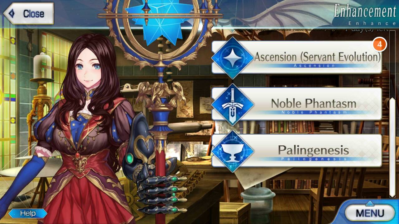 Palingenesis is an option found in Da Vinci’s shop where the player can use the Holy Grail. In doing so, it increases the max level of a particular servant up to 2 levels. This may also include bolstering its stats such as granting higher bonuses to their ATK and HP. In doing so, it may grant the servant a more combative edge against its enemies.
