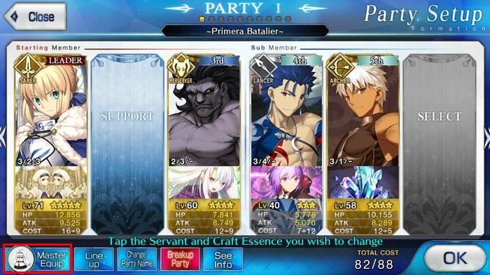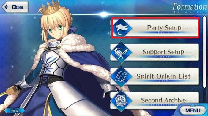 Once there, tap “Party Set-Up”. Here, the player can swap out servants depending on what kind of team build they are looking for. For more information about team builds, click here.