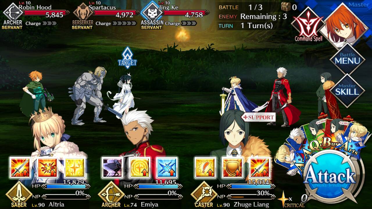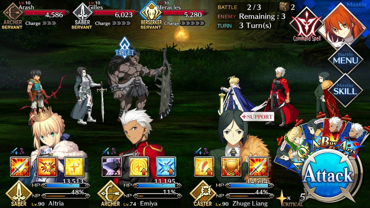 Arash (Lvl 10/ Archer/ 4586 HP) Gilles (Lvl 10/ Saber/ 6023 HP) Heracles (Lvl 10/ Berserker/ 5280 HP)