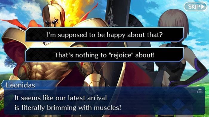 Leonidas intends to have the protagonist train as a means to “fortify his/her body”. He believes that because the protagonist is a mage, the mage does not care about physically strengthening the self. Thus, he departs to fix that problem. However, he pits the protagonist and his/her servants against other servants in order to train him/her.