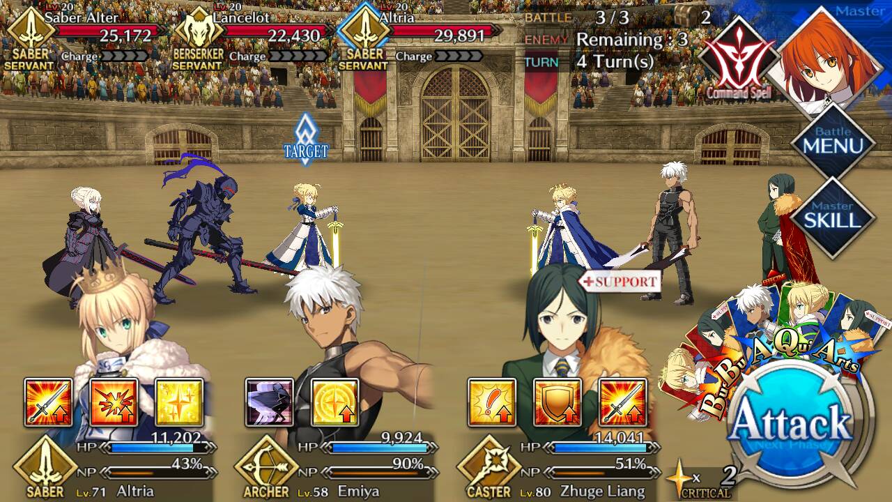 | Altria Pendragon (Lvl 20/Saber/ 29,841 HP) | Lancelot (Lvl 20/Berserker/ 22,430 HP) | Altria Pendragon [Alter] (Lvl 20/Saber/ 25,172 HP) |