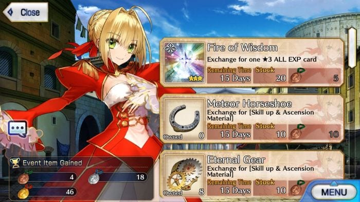 To Exchange: Nero Medals can be exchanged for the following items. Tap the “Trade” button on the home screen or the “Exchange Event Items” button in the Da Vinci Workshop, then select Nero Fest event banner to begin.