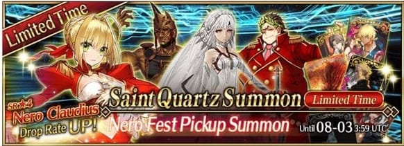 SR Nero Claudius and 3 other Servants will have increased drop rates. Please note that for a 10x Summon, there is 1 guaranteed 4 Star (SR) or above Card* and 1 guaranteed 3 Star (R) or above servant.