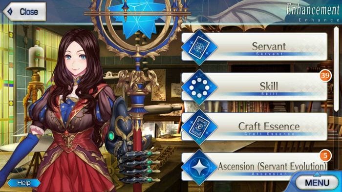 When one enters Da Vinci’s shop, she offers a variety of services that the player can use. However, these come with a price which one pays with Quantum Pieces [QP]. Some of these options involve Ascension, Skill Reinforcement, Palingenesis, leveling up one’s Noble Phantasm, and basic Servant and Craft Essence enhancement. Each Servant and Craft Essence enhancement amount varies depending on the rarity of the Servant and Craft Essence.