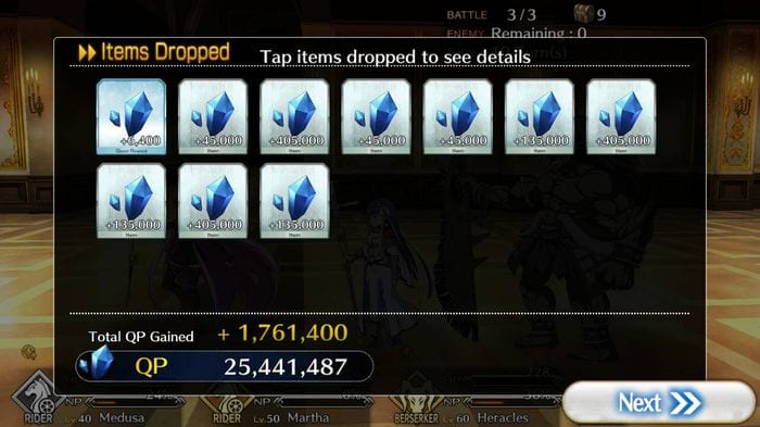 More commonly known as QP, Quantum Pieces serve as the currency in Fate Grand Order [FGO]. As the player goes through a variety of quests and battles, QP always serves as a reward at the end of each battle. Quantum Pieces [QP] often come in big numbers which serve as a means to help the player do a variety of things.