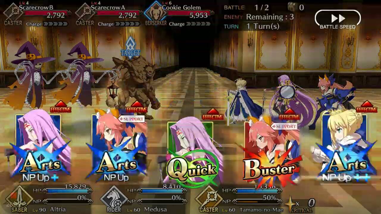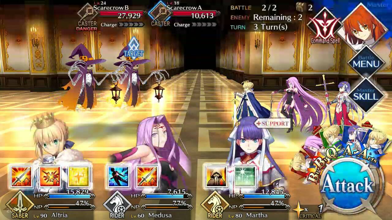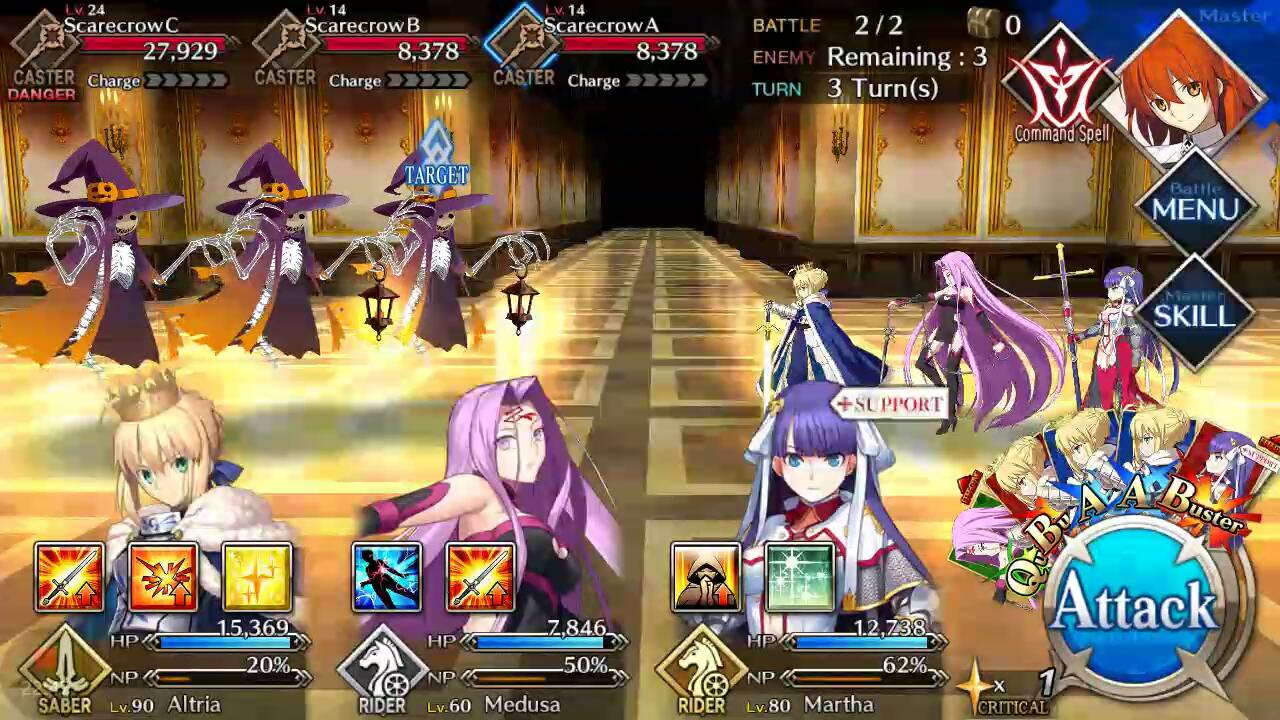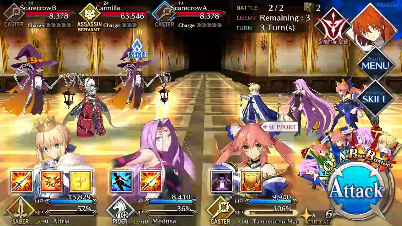 | Scarecrow (Lvl 14/ Caster/ 8378 HP) | Carmilla (Lvl 24/ Assassin/ 63546 HP) | Scarecrow (Lvl 14/ Caster/ 8378 HP) |