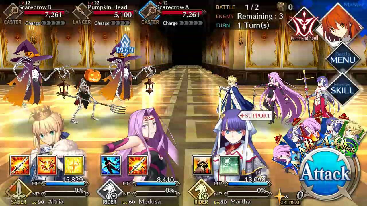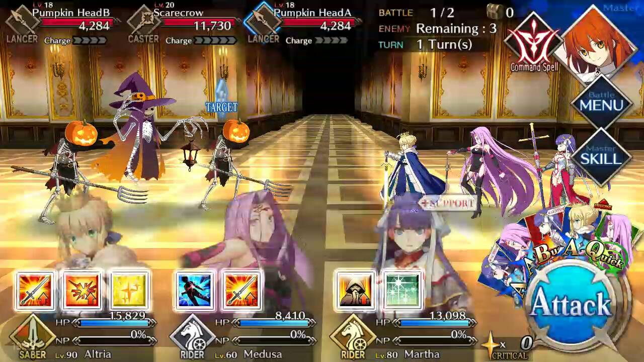 | Scarecrow (Lvl 12/ Caster/ 7261 HP) | Pumpkin Head (Lvl 22/ Lancer/ 5100 HP) | Scarecrow (Lvl 12/ Caster/ 7261 HP) |