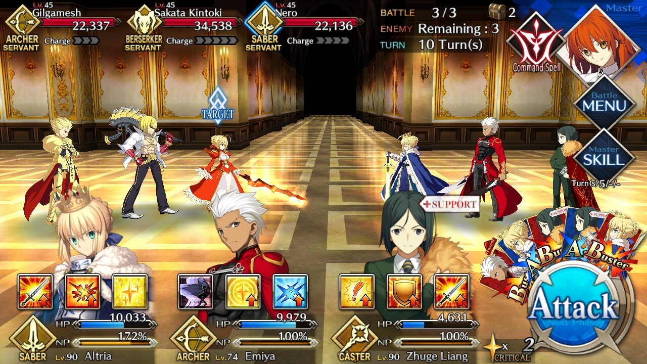 | Gilgamesh (Lvl 45/ Archer/ 22237 HP) | Sakata Kintoki (Lvl 45/ Berserker/ 34538 HP) | Nero (Lvl 45/ Saber/ 22136 HP) |