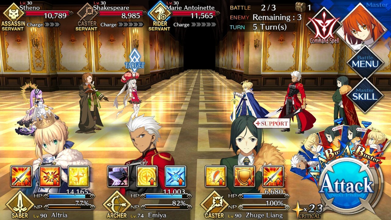 | Stheno (Lvl 30/ Assassin/ 10789 HP) | Shakespeare (Lvl 30/ Caster/ 8985 HP) | Marie Antoinette (Lvl 30/ Rider/ 11565 HP) |