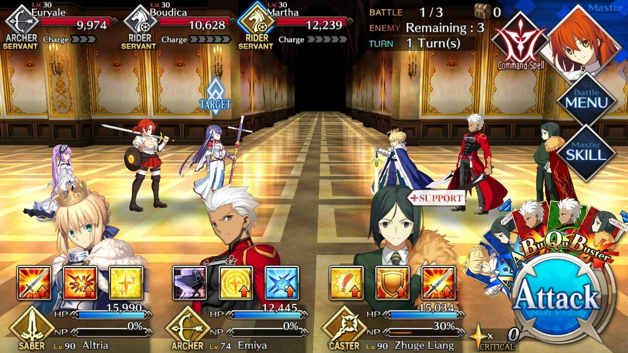 | Euryale (Lvl 30/ Archer/ 9974 HP) | Boudica (Lvl 30/ Rider/ 10,628 HP) | Martha (Lvl 30/ Rider/ 12,239 HP) |