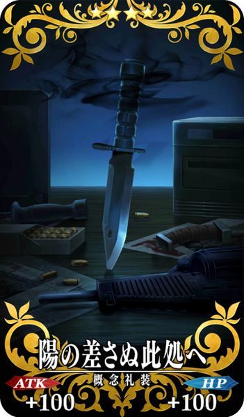 | Normal | When equipped on EMIYA (Assassin), Increase Party’s Quick Card performance and Arts Card performance by 10% while he’s on the field. |