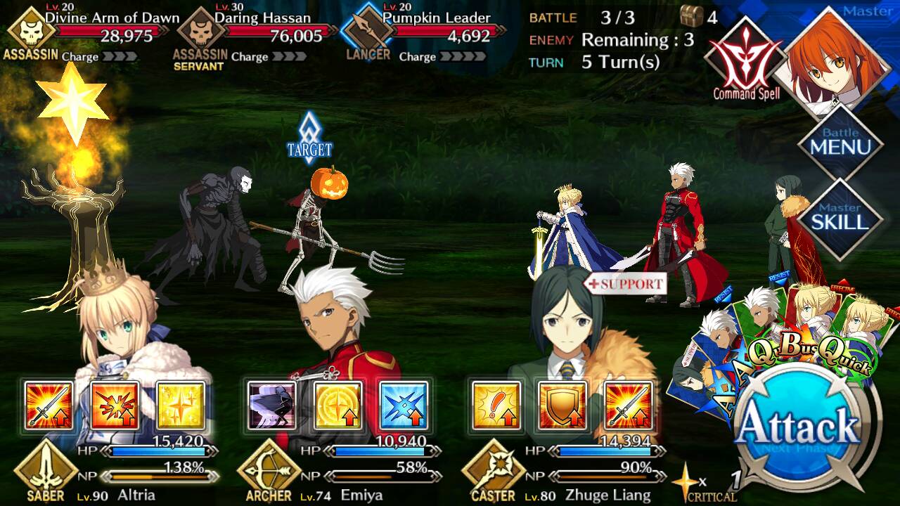 | Divine Arm of Dawn (Lvl 20/ Assassin/ 28975 HP) | Daring Hassan (Lvl 30/ Assassin/ 76005 HP) | Pumpkin Leader (Lvl 20/ Lancer/ 4692 HP) |