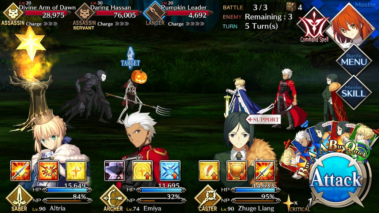 Divine Arm of Dawn (Lvl 20/ Assassin/ 28975 HP) Daring Hassan (Lvl 30/ Assassin/ 76005 HP) Pumpkin Leader (Lvl 20/ Lancer/ 4692 HP)