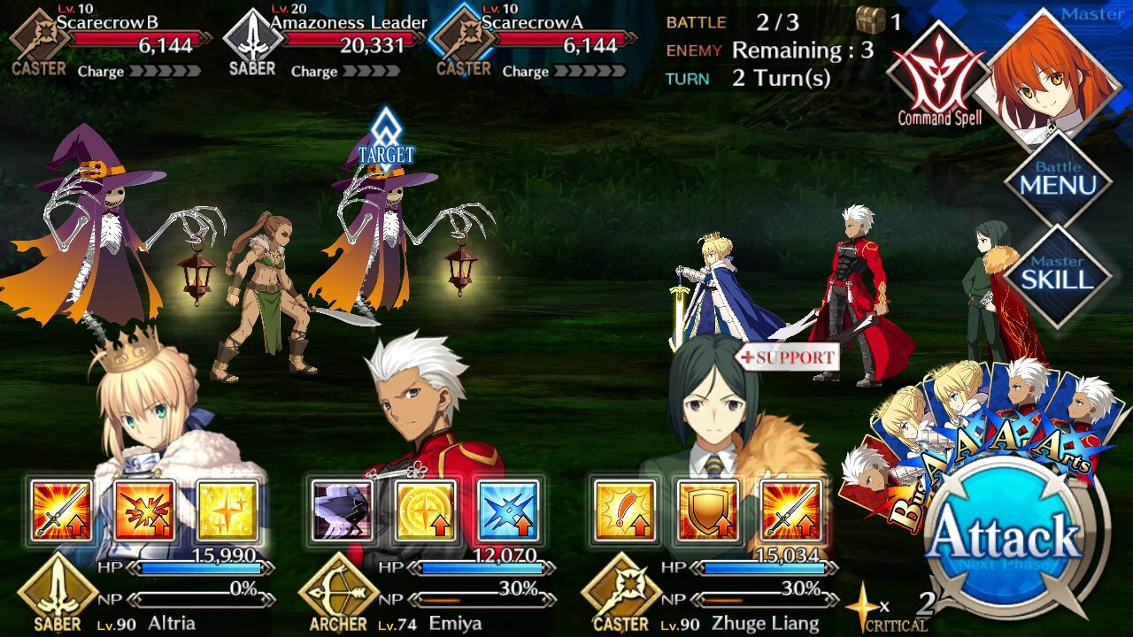 | Scarecrow (Lvl 10/ Caster/ 6144 HP) | Amazoness Leader (Lvl 20/ Saber/ 20, 331 HP) | Scarecrow (Lvl 10/ Caster/ 6144 HP) |