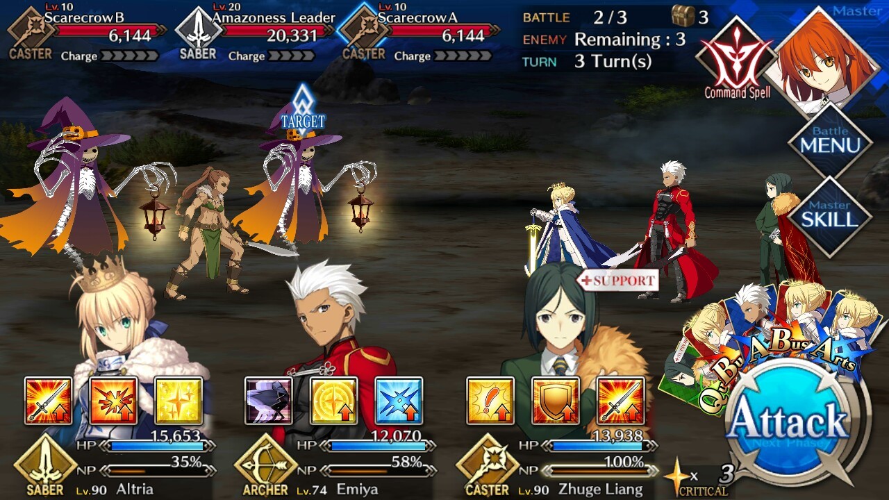 | Scarecrow (Lvl 10/ Caster/ 6144 HP) | Amazoness Leader (Lvl 20/ Saber/ 20, 331 HP) | Scarecrow (Lvl 10/ Caster/ 6144 HP) |