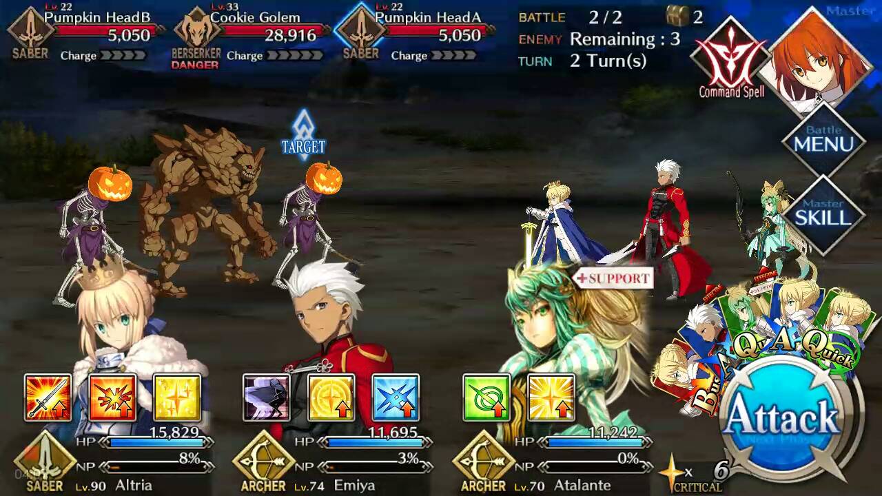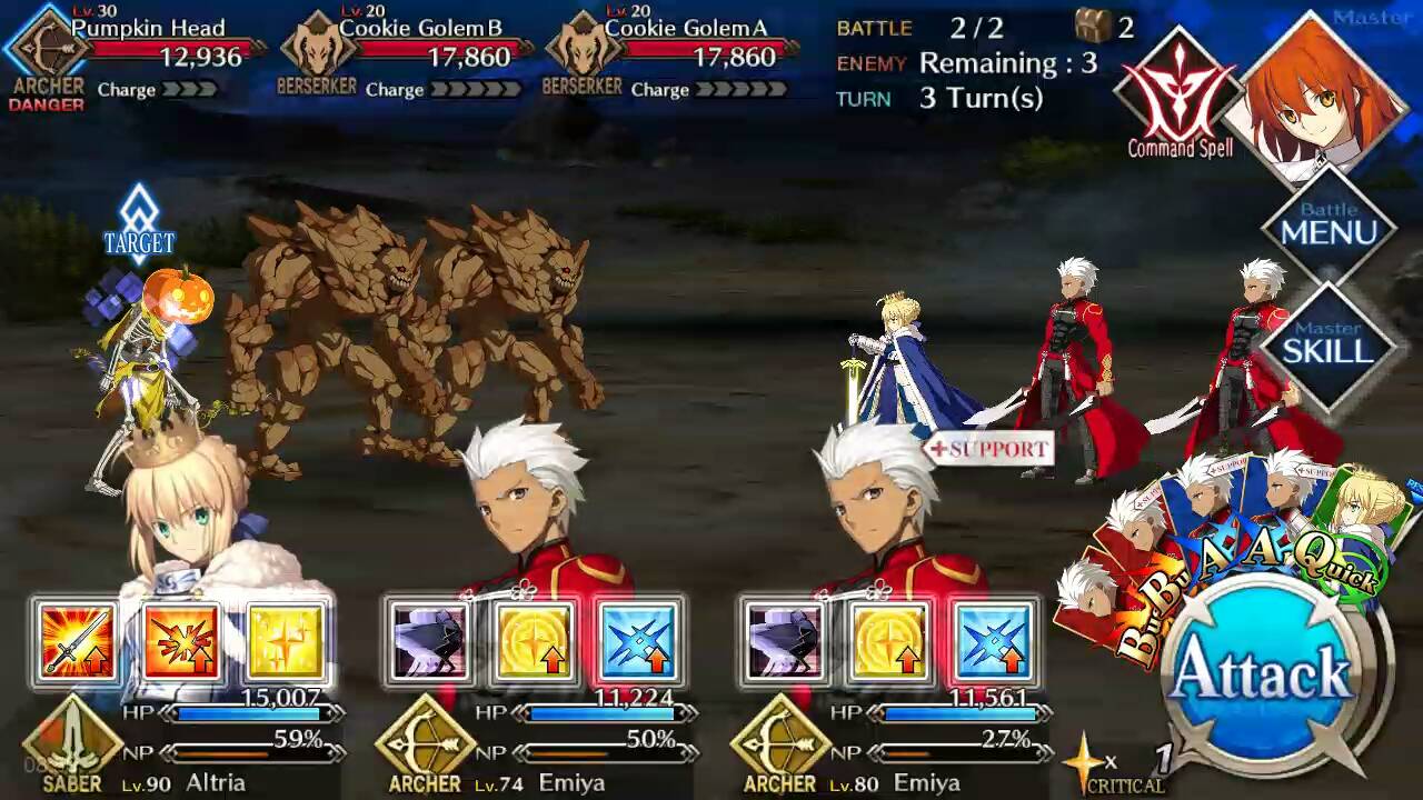 | Pumpkin Head (Lvl 22/ Saber/ 5050 HP) | Cookie Golem (Lvl 33/ Berserker/ 28916 HP) | Pumpkin Head (Lvl 22/ Saber/ 5050 HP) |
