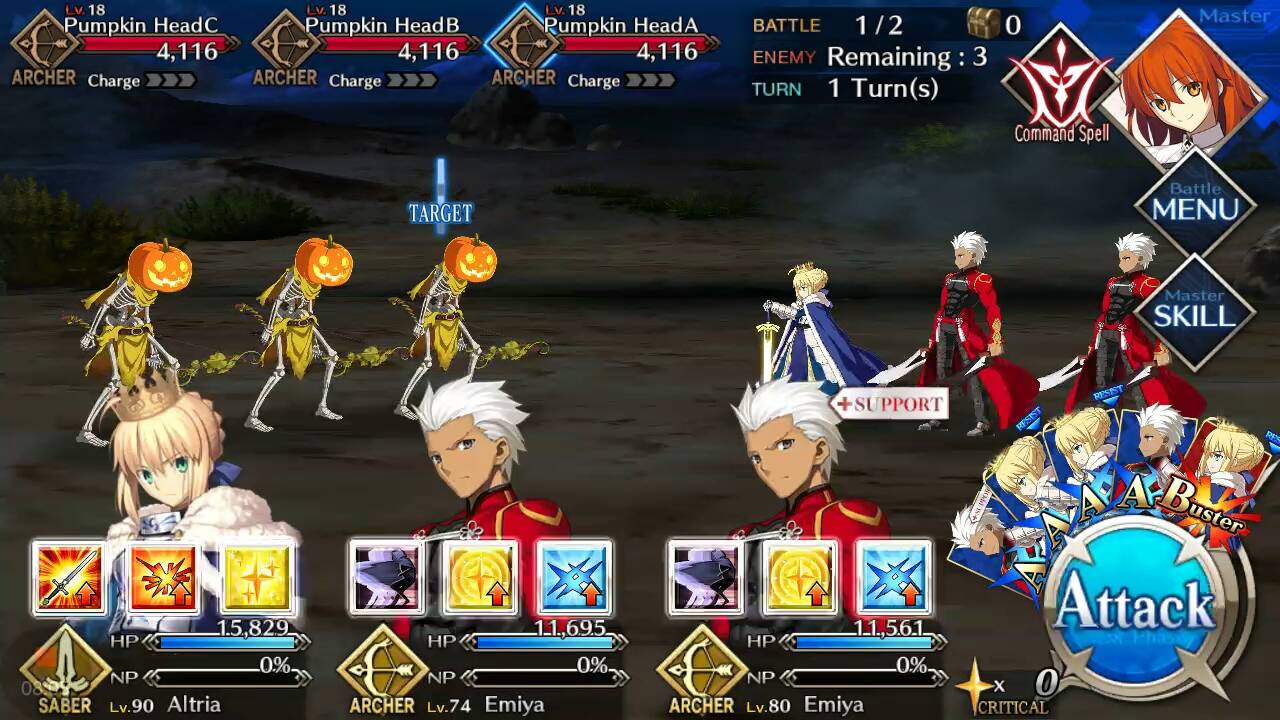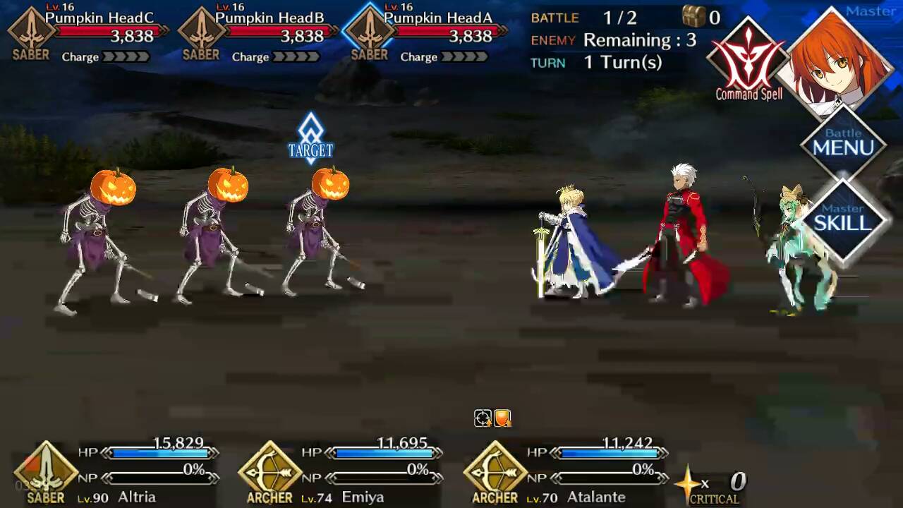 | Pumpkin Head (Lvl 16/ Saber/ 3838 HP) | Pumpkin Head (Lvl 16/ Saber/ 3838 HP) | Pumpkin Head (Lvl 16/ Saber/ 3838 HP) |