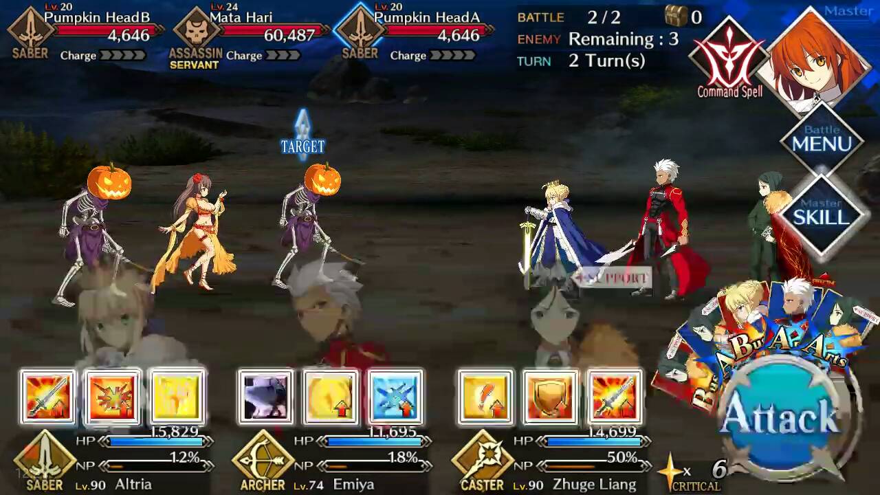 | Pumpkin Head (Lvl 20/ Saber/ 4646 HP) | Mata Hari (Lvl 24/ Assassin/ 60487 HP) | Pumpkin Head (Lvl 20/ Saber/ 4646 HP) |