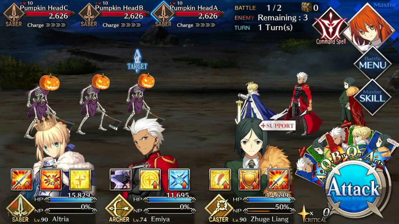 | Pumpkin Head (Lvl 10/ Saber/ 2626 HP) | Pumpkin Head (Lvl 10/ Saber/ 2626 HP) | Pumpkin Head (Lvl 10/ Saber/ 2626 HP) |