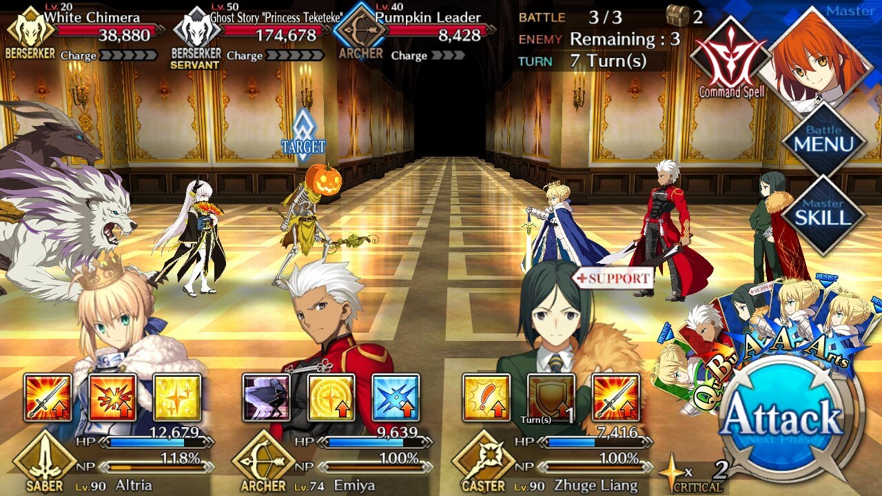 | White Chimera (Lvl 20/ Berserker/ 38,880 HP) | Ghost Story “Princess Teketeke” (Lvl 50/ Berserker/ 174678 HP) | Pumpkin Leader (Lvl 40/ Archer/ 8428 HP) |