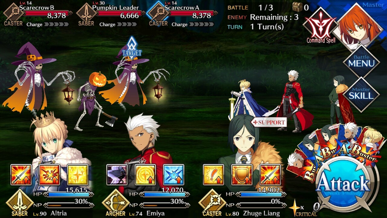 | Scarecrow (Lvl 14/ Caster/ 8378 HP) | Pumpkin Head (Lvl 14/ Lancer/ 6666 HP) | Scarecrow (Lvl 14/ Caster/ 8378 HP) |