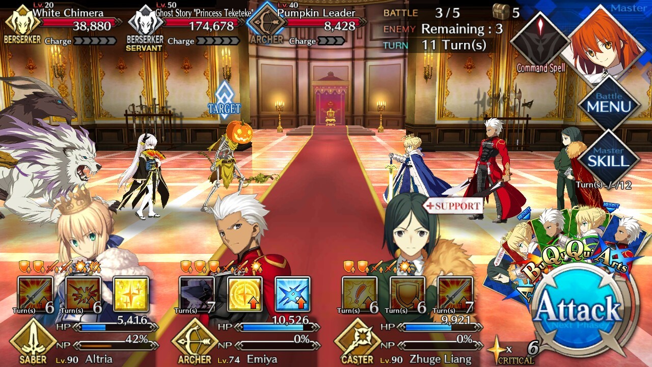 | White Chimera (Lvl 20/ Berserker/ 38,880 HP) | Ghost Story “Princess Teketeke” (Lvl 50/ Berserker/ 175678 HP) | Pumpkin Leader (Lvl 40/ Archer/ 8428 HP) |