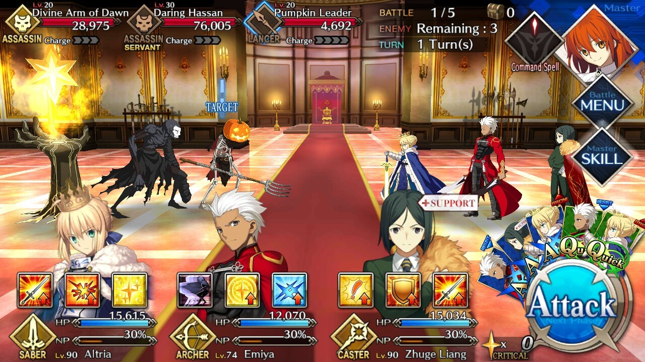| Divine Arm of Dawn (Lvl 20/ Assassin/ 28975 HP) | Daring Hassan (Lvl 30/ Assassin/ 76005 HP) | Pumpkin Leader (Lvl 20/ Lancer/ 4692 HP) |