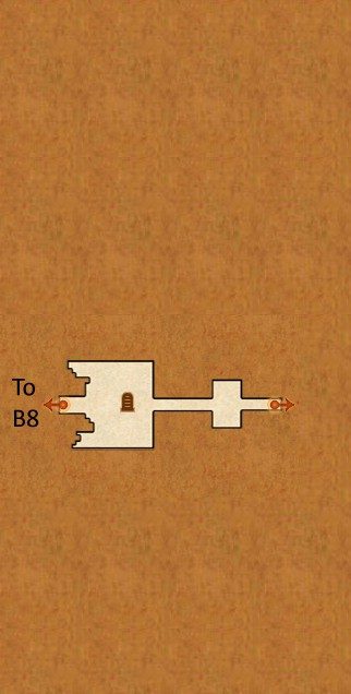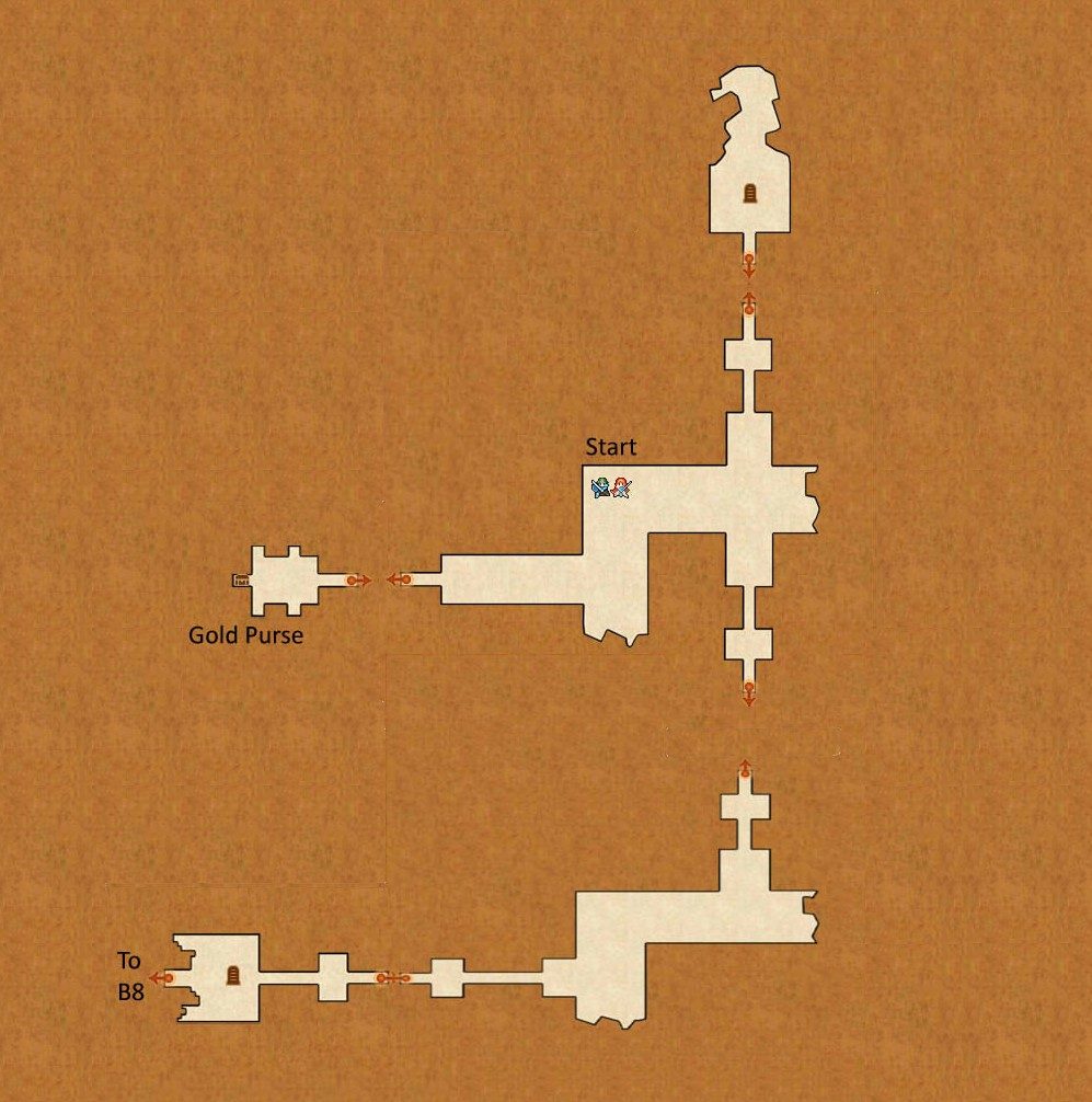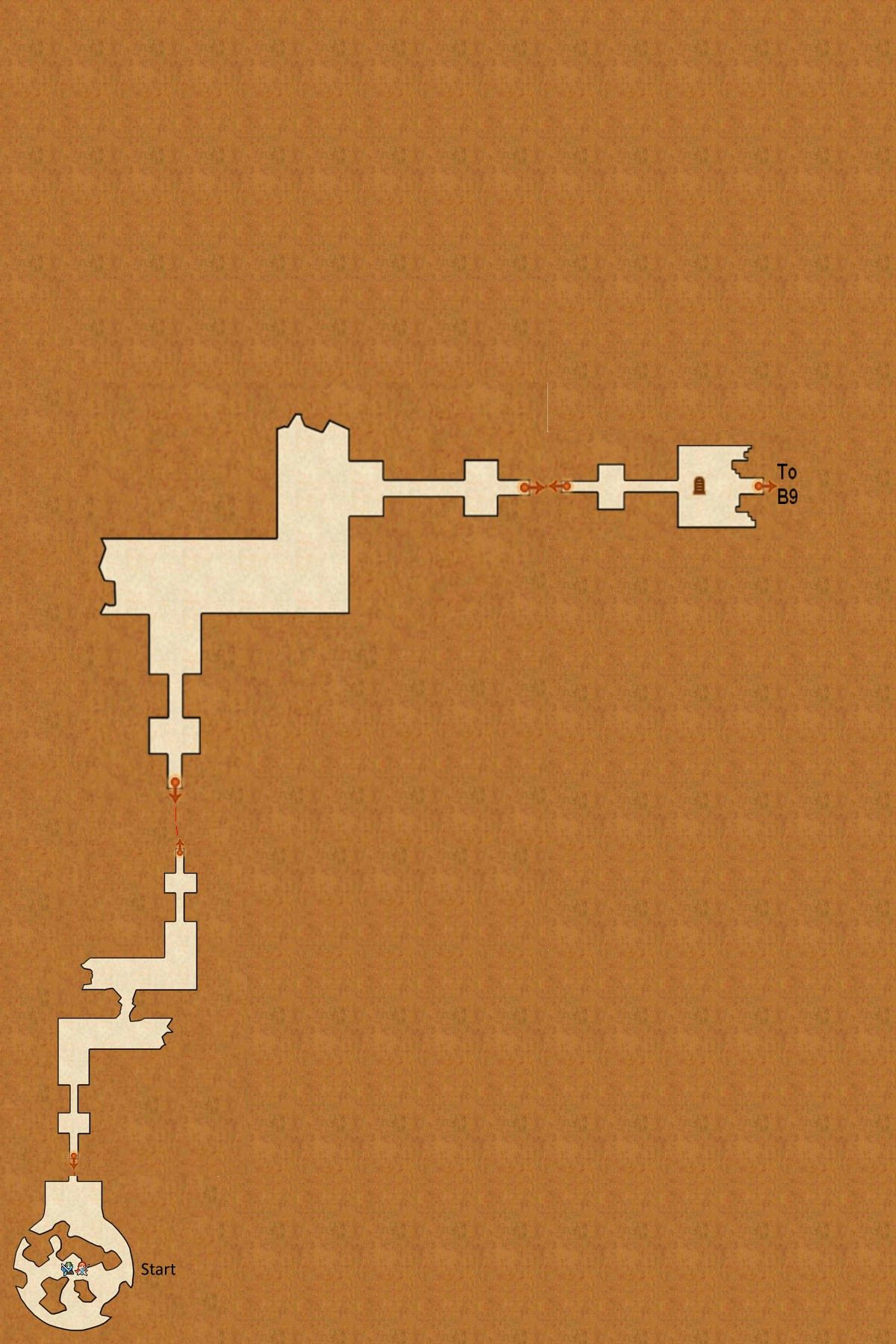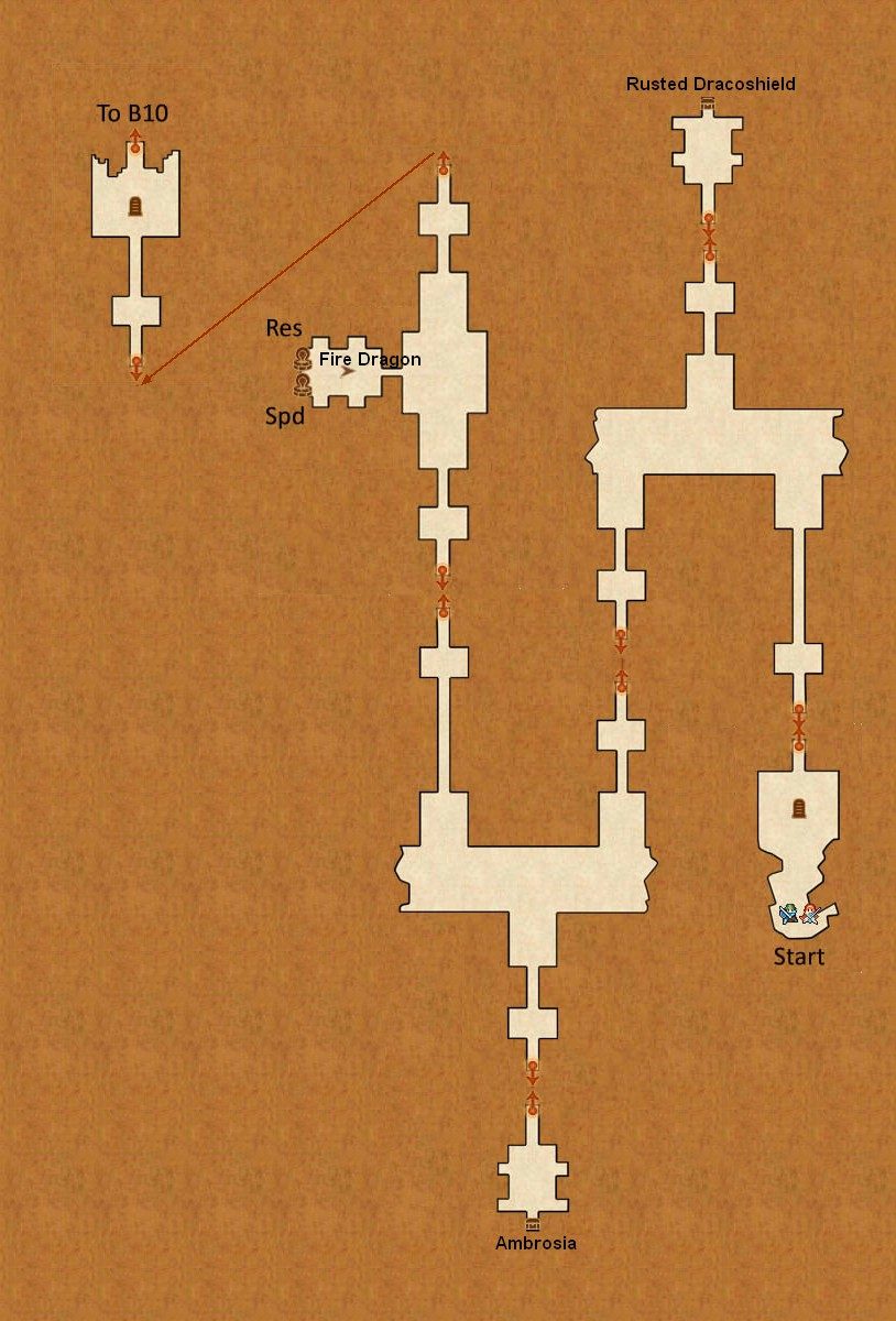 Basement 9 is a big floor. First, walk past the tombstone. This leads you to a hallway where you again have two corners. The first corner on your right, head in there to enter the room with a Rusted Dracoshield. Leave the room and head to the second corner that leads you out to the next map. Upon reaching the next map, there are two corners again. The first corner will be on your left which leads you to a room containing Ambrosia. The last corner will then lead you to the second part of Basement 9.