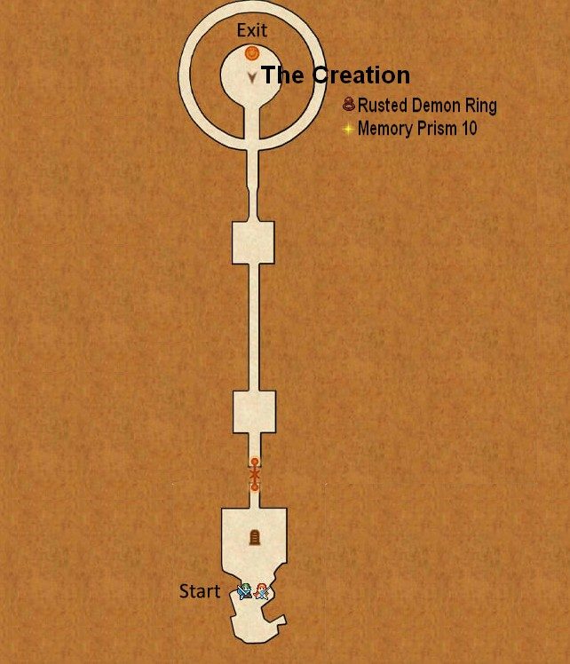 Once you reach the tenth hall then, congratulations – you’re at the last hall in Thabes Labyrinth. Head past the tombstone and into the next hall. There, you’ll meet the final boss – The Creation which gifts a Rusted Demon Ring, 1000 Renown, and the final Memory Prism.