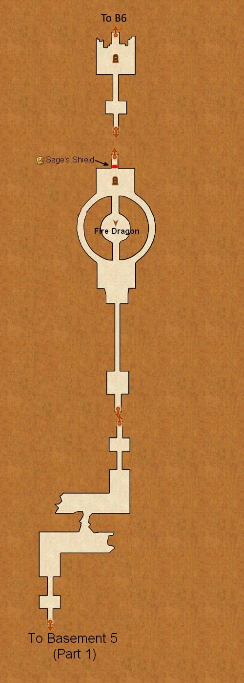 Once you get into the hall which marks the second part, follow the path. There’s only one way out before finally reaching this long stretch. Upon reaching the stretch, there’s a Fire Dragon at the end of the hallway. Behind the room that contains the Fire Dragon, there’s a Sage Shield. Grab that before heading into the next room that has a tombstone that marks the end of Basement 5.