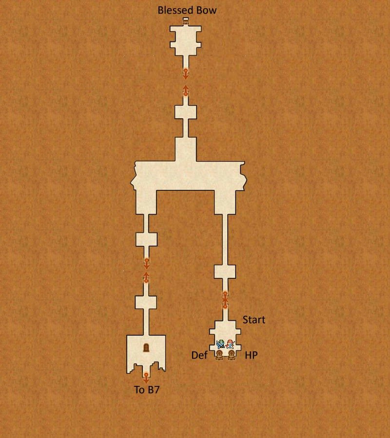 Once you hit B6, grab the two springs behind you containing Def and HP. After that, head out and follow the path until you reach a split hallway. If you’re facing the wall in front, on your immediate right, there’s a room containing a Blessed Bow. The next corner at the end of the hallway leads to the exit of Basement 6 and into Basement 7.