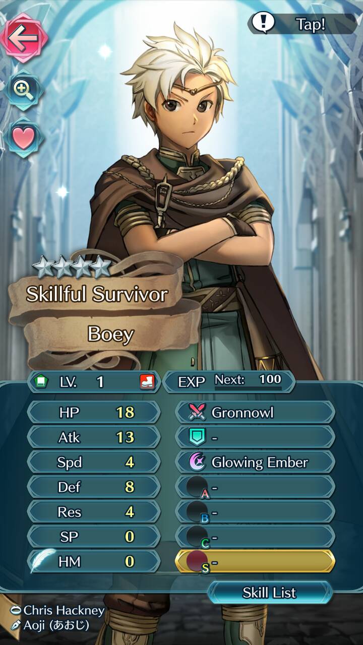 Boey has a pretty decent attack for a 4☆. And surprisingly, he can take in more physical damage than he can magical damage. Unlike most tome users, Boey can soak up physical damage as he continues to increase his power. One of the signature moves he uses, Glowing Ember, displays the level of his physical defense. Even if attacked by a bow-user, he can take in damage which allows him to counter attack.