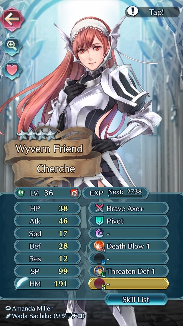 Cherche is a flying unit bestowed with an enormous Attack stat however this comes at the expense of her abysmal Speed and paper thin Resistance. Her default kit is lacking inhibiting her from capitalizing on what she does best as an offensive type unit.