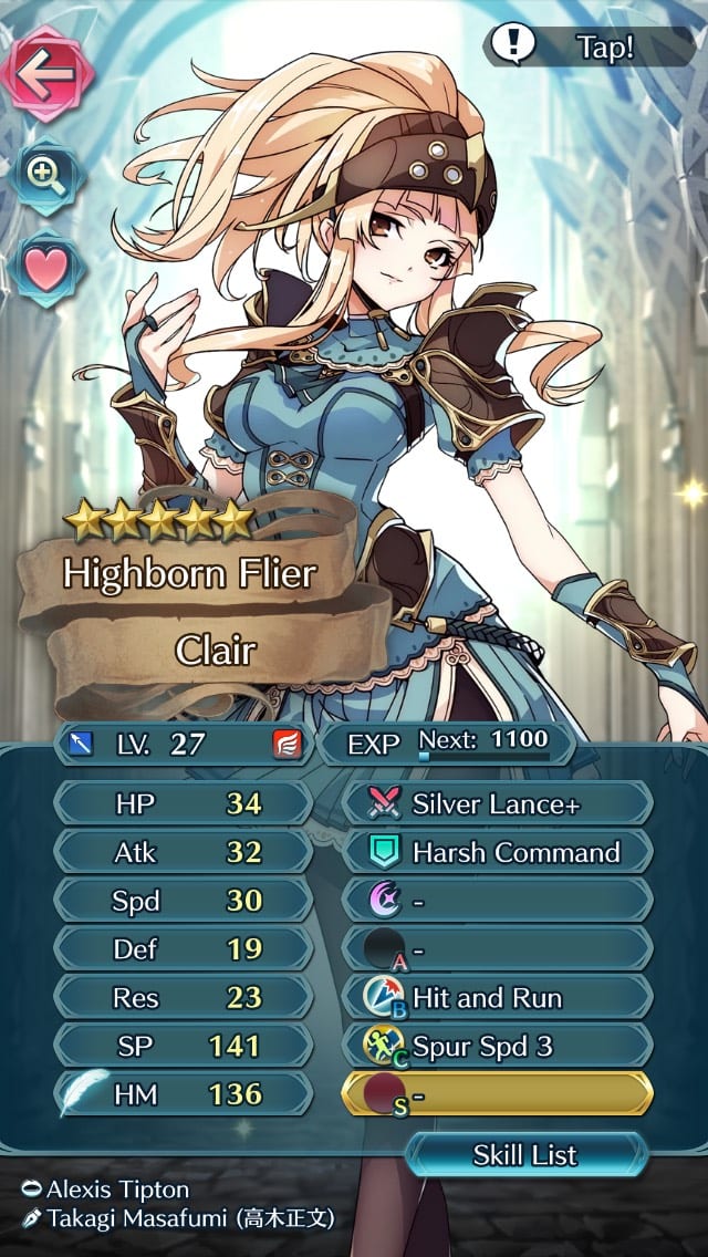 Clair is a blue flier with significant Speed and notable Resistance. Thanks to her base speed, she is capable of evading follow-ups from tome units and dish out decent damage by the time she catches up to them.
