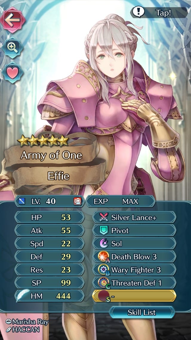 Effie functions as a sturdy wall to sponge enemy attacks given her significant Defense stat. Her Attack coupled with the default kit grants her with a monstrous damage output, while shouldering enemy phases with Wary Fighter to deter follow-ups.
