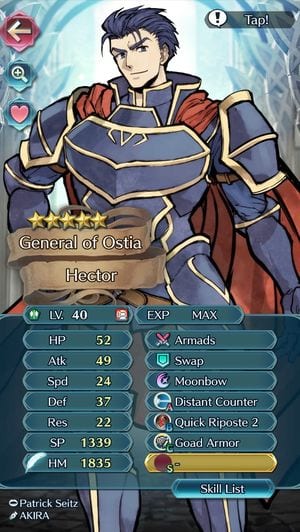 Because of his tankiness, Hector becomes a valuable member of the team. His ability to stall a battle to allow you to pick your enemies off one by one is what can win you a battle. Also, he has the ability to aid armoured units in combat such as Effie or Draug. Being a five star as well, he has higher stats than most.