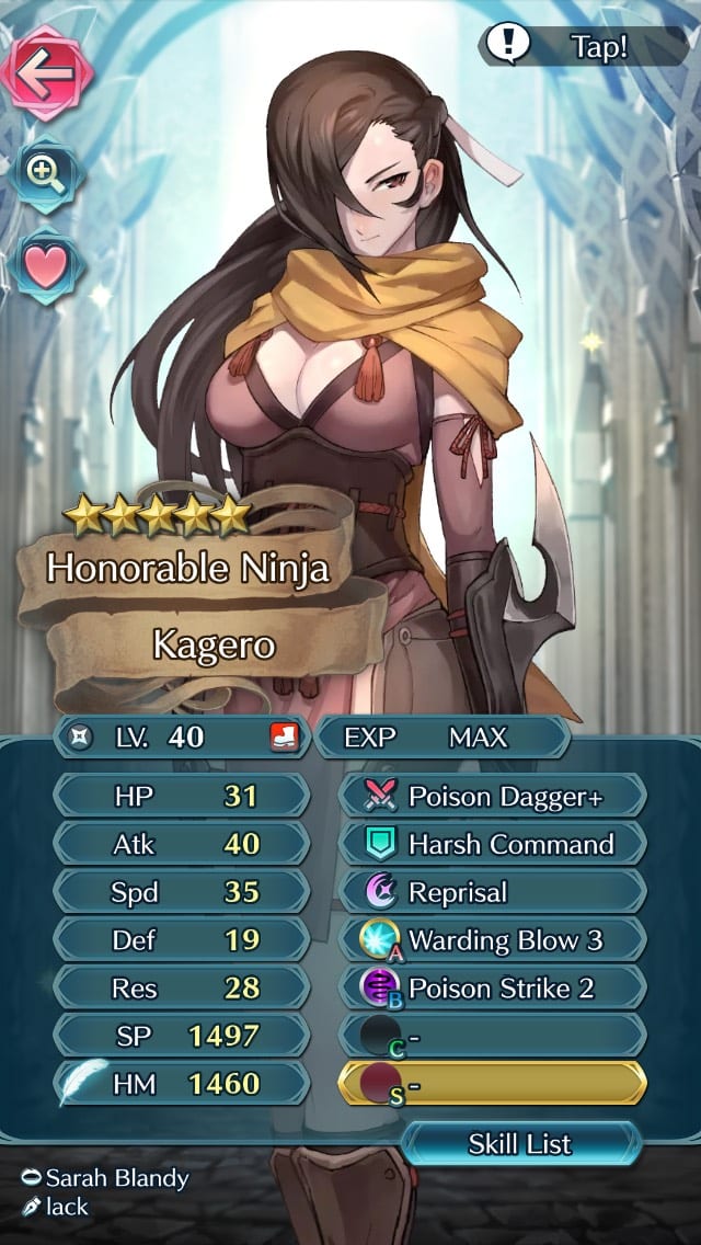 Kagero has stellar ATK, and commendable SPD and RES. She raises the bar as the highest ATK among all dagger-type units with Poison Dagger. Speed-wise, she can deal double-damage to average SPD infantry units notably Nowi. Functions as an effective counter against most tome users during the player phase, given that they do not come with buffs.